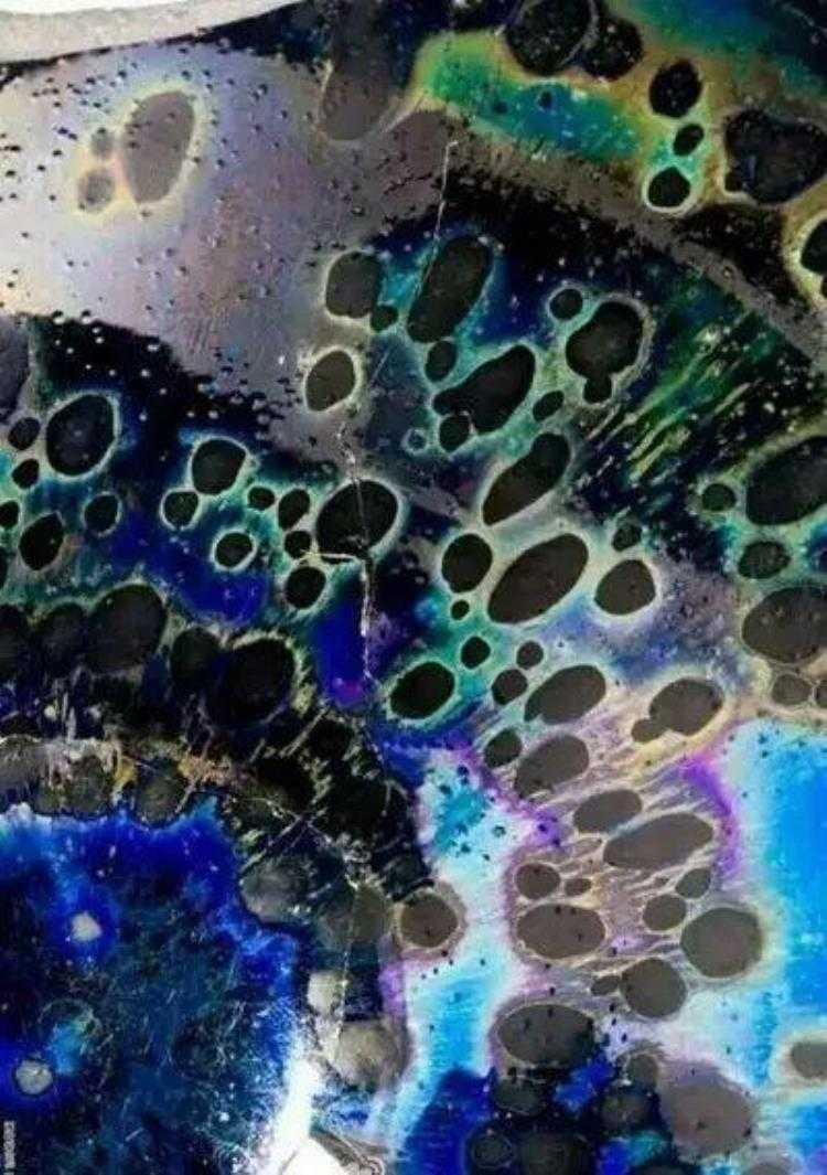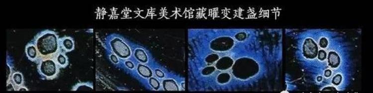 在黑釉中浮现着大大小小的斑点,且这些斑点四周围绕着红、绿、天蓝等彩色光晕在不同方位的光照下闪耀。随着观察角度的不同而出现大面积的色彩变幻。