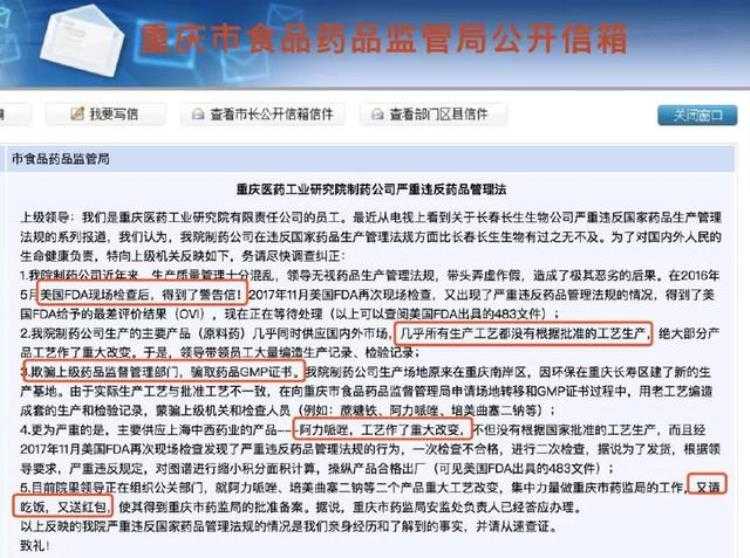 重庆医工院为复星医药旗下控股孙公司。在重庆食药监局信箱中,一封自称来自该公司员工的举报信提出了五大问题,其中之一为美国FDA(美国食药监局)出具的警告信。