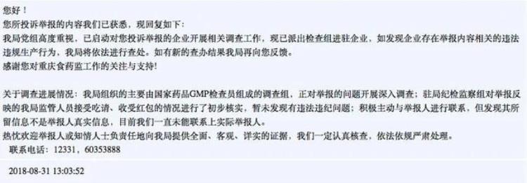 2018年8月31日,重庆食药监局更新了举报信的调查进展状况。称驻局纪检监察组对举报反映的监管人员接受吃请、收受红包的情况进行了初步核实,暂未发现有违法违纪问题。