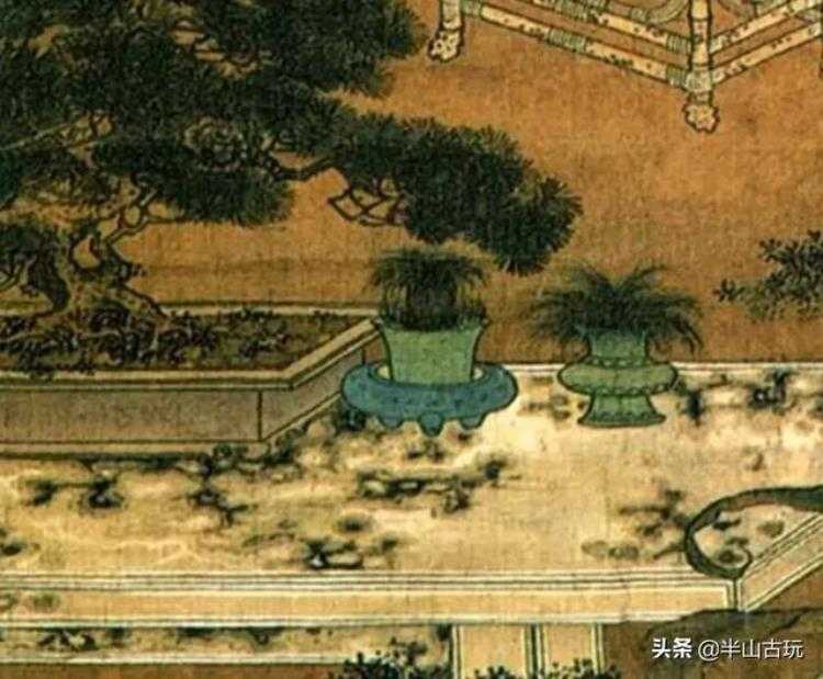 2012年中国嘉德秋拍出现过一卷明宪宗朱见深《御花园赏玩图》,最终拍出1817万元高价,图中我们就可以看到这种钧窑花盆在御花园的存在。