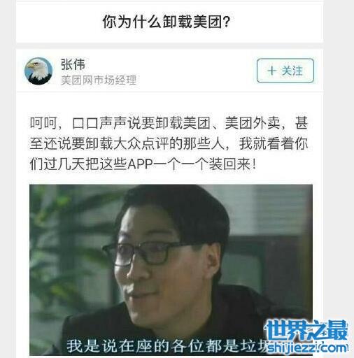 对于这次的美团清真事件,美团网市场经理张伟在知乎上也做出了回应,不过这个回应并不是网友们想看到的,短短三行字,全都是激烈的言辞,似乎完全不在意这次引发的美团清真事件,甚至扬言,那些说要卸载美团的人,会看着你们再装回来,而且还配了一张同样很不正面的图片,不知道美团高层怎么看待这件事情。
