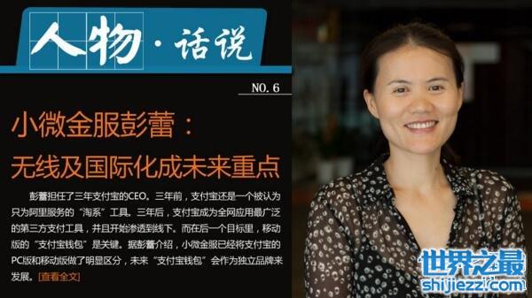 彭蕾,是阿里巴巴创始人之一,2013年3月7日阿里巴巴集团正式宣布筹备成立阿里小微金融服务集团,彭蕾出任小微金融服务集团CEO。这是最有前途的金融业务,而且她的老公是淘宝网的第一任总裁孙彤宇。