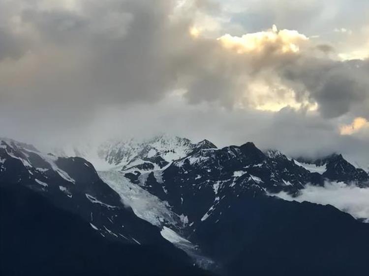 也许神山有灵,尚有慈悲。卡瓦格博的白雾就像幕布一般从中间拉开,云雾向着两边翻滚。在一刹那间,家属们就看到了金色的霞光打在了卡瓦格博峰顶上,巍峨的雪山,如同披上了一件金色的法衣,端坐在莲花之上。一瞬间,笼罩在亲友们心中的悲伤,都驱散至尽。
