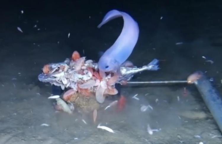可惜它们的游速太快了,水下机器人根本追不上它们,不然还能抓几条回来看看。不过也不是一无所获,水下机器人抓了一种甲壳类生物,外表像没有头部的虾子。全身呈红色,就像烧熟了一样。