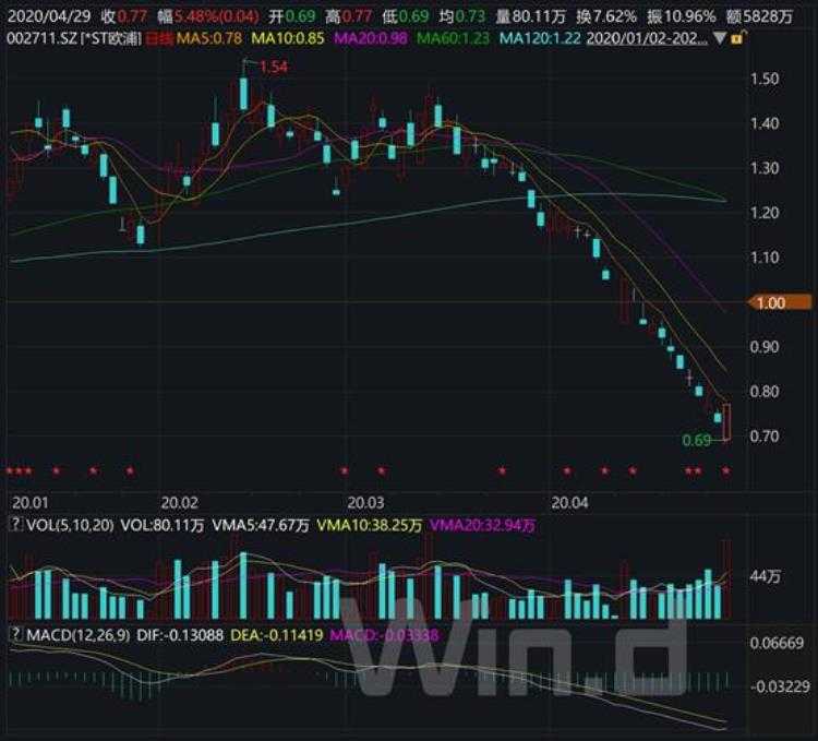 *ST欧浦于2014年上市,发行价格18.29元/股,上市首日市值近40亿元。2015年股价一度达到125.55元,市值178.21亿元。2019年5月股价跌破2元,此后一直在1元上下徘徊。今年以来,股价震荡下行,截至4月30日停盘前已连续10个交易日股价不足1元,市值仅为8.13亿元。