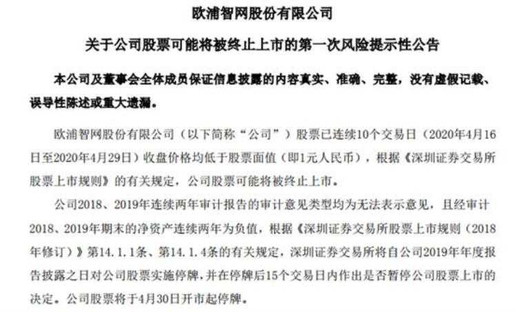 2020年4月29日,公司发布公告称,由于2018、2019年连续两年审计报告的审计意见类型均为无法表示意见,且经审计2018、2019年期末的净资产连续两年为负值,深圳证券交易所将自公司2019年年度报告披露之日对公司股票实施停牌,并在停牌后15个交易日内作出是否暂停公司股票上市的决定。现公司股票已于4月30日停牌。
