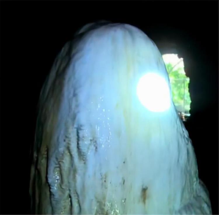 在解开龙雾形成的谜团后,考察组打着手电筒继续往内走去。首先映入众人眼帘的,是一个高大开阔的洞厅,一些大小不一的石柱就在洞厅内屹立着。