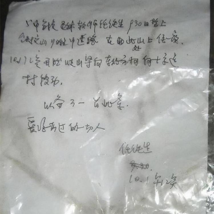 “五中退休教师任铁生,9月30日登上铁陀山,过程中迷路,在此处留宿一夜。10月1日12点开始顺山梁向东北方向十字道村移动。以备万一留此条,爱给所过的一切人。任铁生,10月1日中午12点。”