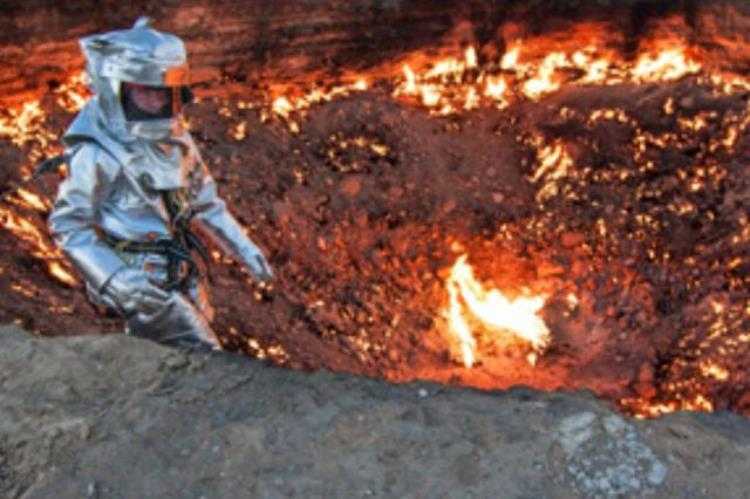 1944年,44岁的加拿大探险家乔治•库鲁尼斯来到了火坑口,他此行的目的是在火焰坑表面行走,并采集岩石和泥土样本,他穿着耐热铝制防护服、头戴呼吸装置,通过绳索下降到了30多米的坑底,在1000多度的高温中停留了15分钟,最终完成了这个极高难度的冒险,他也是世界上第一个进入土库曼斯坦地狱之门的人,在面对记者的采访中,他说出了这样一句话,“我是世界上第一个挑战这里的人,也为科学做了一份贡献。我热爱探险队的一切!”在很多人眼中,这个持续燃烧的火坑是吞噬生命的地狱,但对他来说,这只是一场人生路上的冒险而已。