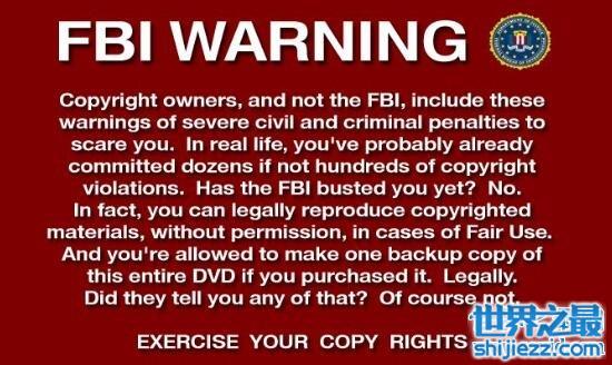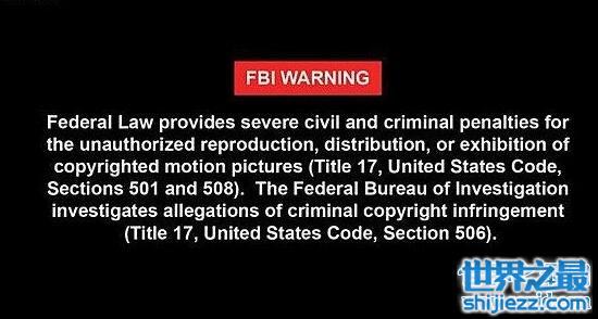 在美国本土播放的影片,或者一般影片,自然没必要脱裤子放屁了。其实这就像岛国片子那越来越薄却不可或缺的马赛克一样,都是钻法律的空子。法律不允许裸露xx部位,那便打码,对xx视频的观看者有年龄限制,便片头加上FBI warning,实际作用和掩耳盗铃没两样。