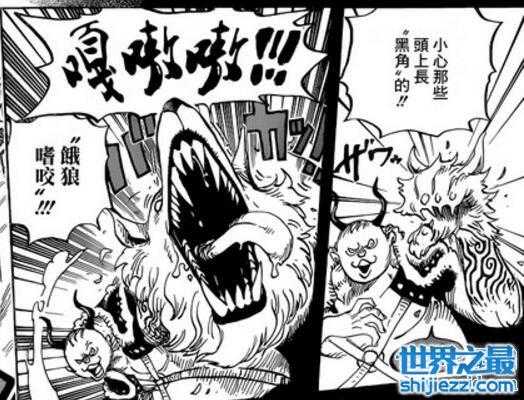 在海贼王动漫第809话中,凯撒版人造果实能力者以这位狼兄举例的话可以发现了值得注意的地方:头上长黑角且只能局部兽化。动物系恶魔果实能力者有三种形态:人、兽、兽人形态。这位狼兄应该是准备进入兽形态,但是不能全身进入兽形态,只能局部。并且兽化部位根部出现了类似漩涡纹理的文身。值得注意的是,凯撒的人造恶魔果实绝对是有弊处的,部分兽化说明不稳定,只不过目前还不清楚缺陷。