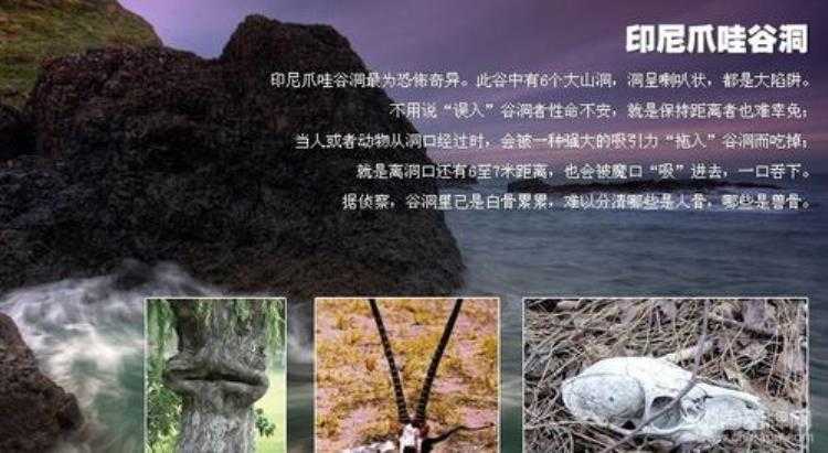 印度尼西亚的爪哇岛,就像上帝赐予亚当和夏娃的伊甸园一样美丽、富饶。伊甸园里有上帝明令亚当、夏娃不需采食的禁果,在印尼的爪哇岛上也有一个活物禁入的区域,这就是凶名赫赫的印尼死亡谷——爪哇谷洞 印尼爪哇谷洞最为恐怖奇异。此谷中有6个大山洞,洞呈喇叭状,都是大陷阱。不用说“误入”谷洞者性命不安,就是保持距离者也难幸免。当人或者动物从洞口经过时,会被一种强大的吸引力“拖入”谷洞而被吃掉。就是离洞口还有6至7米距离,也会被魔口“吸”进去,一口吞下。据当地人讲述,谷洞里已是白骨累累,难以分清哪些是人骨,哪些是兽骨。对于爪哇谷洞的由来也是众说纷纭。 回顾历史,早在公元前已有中国人漂洋过海到爪哇岛了。在爪哇岛上发现了西汉(公元前206年-公元25年)的雕像、陶器和薄绿釉龙勺。荷兰考古学家德·弗玲斯研究印尼出土的中国陶瓷器得出结论,认为远在2000年前中国人已漂洋过海踏上印尼国土,有的可能已在西爪哇的万丹定居下来。 最初来到爪哇岛的中国人,见到爪哇谷洞的凶险之后,认为谷洞中所居住的就是神话传说中所提到的一种神秘怪兽——饕餮。饕餮,是龙的第五子。传说中饕餮和羊的身材比较接近,眼睛生于腋下,长着老虎的牙齿,人的手掌。饕餮的头很大,并且头上长着一张大嘴,只要嘴一张开,周围所有的东西都会被其吞入腹中。饕餮十分贪吃,见到什么就吃什么,因为对食物毫无顾忌,传说中饕餮最终吃的撑破肚子而亡。因此,很多餐具、器皿上都会雕刻上饕餮的花纹。 在爪哇岛的历史上,曾经有一个叫做满者伯夷的国家,郑和下西洋时就到过这里,当时爪哇岛已经是一个商旅不绝于途的航海、商业中转站了。在当时有这么一个关于爪哇谷洞的古老故事被记录、流传了下来。 某年夏天的一个早上,一位陈姓的明朝商人经过一个多月海上航行,来到了爪哇岛,并带来了大批的瓷器和丝绸准备贩卖。这位商人平日里喜好郊游,虽然来过爪哇岛几次,但每次都是匆匆忙忙,根本没有时间游览这里的风景。经过几次的来来往往,他在这里结识了不少同行,这次,他打算自己的这批货物托付给一位本地的朋友代为销售,自己则在岛上四处游玩一番。 这位商人雇用了一个当地的导游,前前后后游玩了三天,对于一个去过名山大川的商人来说,爪哇岛除了风景秀丽一些,环境优美一些,就再也没有什么奇特之处了,商人有些烦闷了。他雇用的这位本地的向导也看出了主顾的心思,为了能让这位有钱人能够多雇用他几天,这位向导就提到了岛上一个无人敢去的地方,也就是爪哇谷洞。商人一听说这个地方,非常激动,决定马上出发,向导却借口地方偏远,让商人先回住地准备一晚,明天一早出发。 当晚向导回到家,把明天要去爪哇谷洞的事情告诉了妻子。妻子一听大吃一惊,忙劝丈夫放弃行程。但是向导已经收了主顾的钱,中途变卦的话就会反赔主顾更多的钱,妻子无奈之下只能同意,但最后劝说丈夫不要离谷洞太近,以免出事。 第二天,商人和向导一大早就前往爪哇谷洞,一路上走得很快,不到中午,两人就来到爪哇谷洞附近。想到妻子的嘱咐,向导开始走得慢下来,可是同行的商人见此却非常恼火,不断催促。又走了一段,向导终于停了下来,指了指前方的峡谷,告诉商人爪哇谷洞就在峡谷里,而且这里非常危险,需要十分小心。商人二话没说,也不顾向导的劝告,就向峡谷走去。 向导跟随其后,但两人之间拉开了很长的距离。只见商人猛的身形一变,朝一边飞去,连一声呼叫声都没有发出,就被卷入到旁边一个不起眼的洞中,接着就从洞中传出一阵阵刺耳的摩擦声,向导看到这一情景,虽然自己对这里的情况早有耳闻,但当他亲眼见到时,却也吓得瘫倒在地。 当时爪哇岛上的满者伯夷国是明朝的附属国,一个明朝商人在爪哇岛遇难,在这里造成了巨大的轰动。满者伯夷国调派了大量人员在爪哇谷洞附近进行搜寻,却毫无结果,在搜寻过程中,两名搜寻人员也不幸被吸入洞中。搜寻无果,最后只能找来商人雇用的向导审问,最终判处没收向导的所有家产,向导本人及其妻、子终身为奴,这才草草收场。 当然,在爪哇谷洞里失踪的并非只有明朝的商人。后来欧洲的传教士也来到这里,他们跋山涉水也有不少人葬身于此。在这些神职人员认为,爪哇岛就像是亚洲的克里特岛,这里的爪哇谷洞就是一个迷宫的出口,迷宫中也居住着一个半人半牛的怪物——米诺陶洛斯,终日里以人为食,只要人畜接近洞口,就会被怪兽吸进去吃掉。也有人说爪哇谷洞中居住的是奇美拉,这种长着狮头、羊身、蛇尾的怪兽喜欢吃人,而且生性胆小,喜欢在背后偷袭猎物。爪哇谷洞为什么会把人畜吸入洞中,真正的答案不得而知。 为了揭开爪哇谷洞的谜团,科研人员用了很多办法,但即便是在动用了高科技工具的情况下,也无法让人们距离真相再向前近一步。 1968年,德国的地质学家拉克索·席勒带队的考察小组来到了这里,为了这次考察成功,他们带来了大量的仪器,这些仪器总价值超过了三百万美元,其中还包括了用于航天科考的工程机器人。考察小组在爪哇谷洞附近安营扎寨,还专门搭建了一间放置各种电子设备的简易房间。前前后后忙碌了近一周的时间,当各项设施都准备完成后,才发现小组里一位专门负责卫星通讯的工程师失踪了。随后所有人都在附近仔细寻找,最后在一个仅容一人通