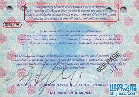 翻译:美利坚合众国国务卿在此要求相关人士给与该美国公民/国民通行便利及在需要时提供合法的帮助与保护。其实并没有传闻中的那么霸道,只是很简单的一句话,当然也是很重要的一句话,而且跟世界上很多国家的护照内容都是一样的。