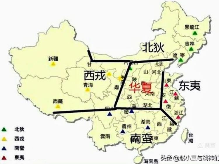 上面一幅来自网络的地图,将陕南、川东北、渝北、湖北框进“华夏”境内,那么地域属“南蛮”的巴蜀楚亦属华夏族了。这不仅因为华夏族的始祖是“西南巴国”的华胥、伏羲(《礼纬》:“夏建寅,宗伏羲。”),而且“夏”源于“夏水”(江夏),后来自称华夏族的汉族其名称源于汉水、汉中王、汉朝。