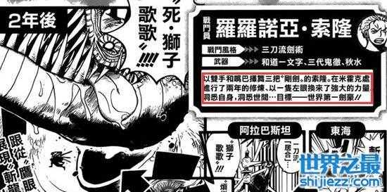 不管是认真还是搞笑,这些猜测确实为索隆的实力带来了极大的不可预测性。然而我们有官方出的特辑来说明官方的观点,这张图出自Jump的特辑,一共两期,是在连载669话最后出现的,为的是纪念超人气漫画海贼王正式进入新世界篇。