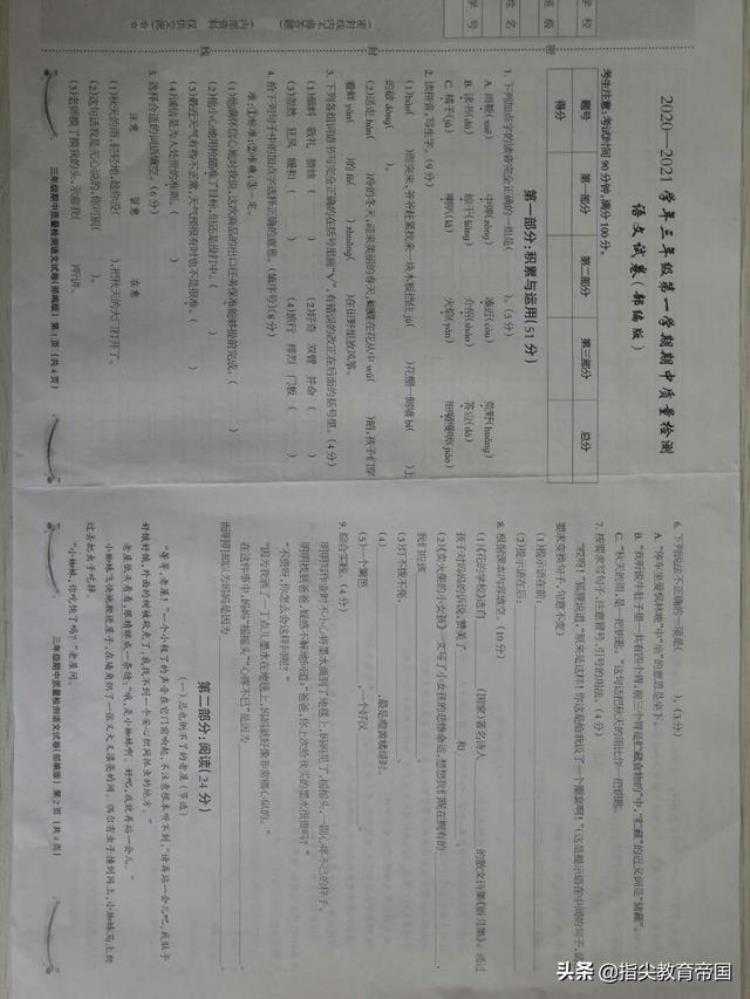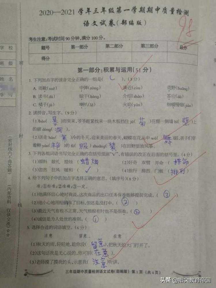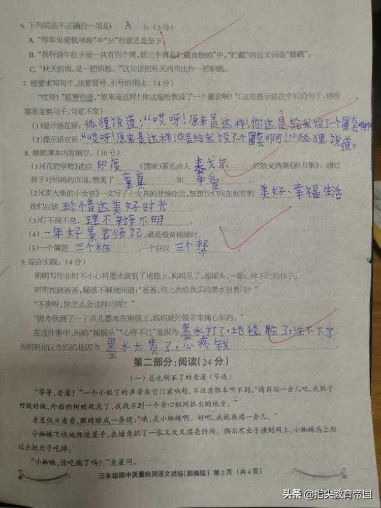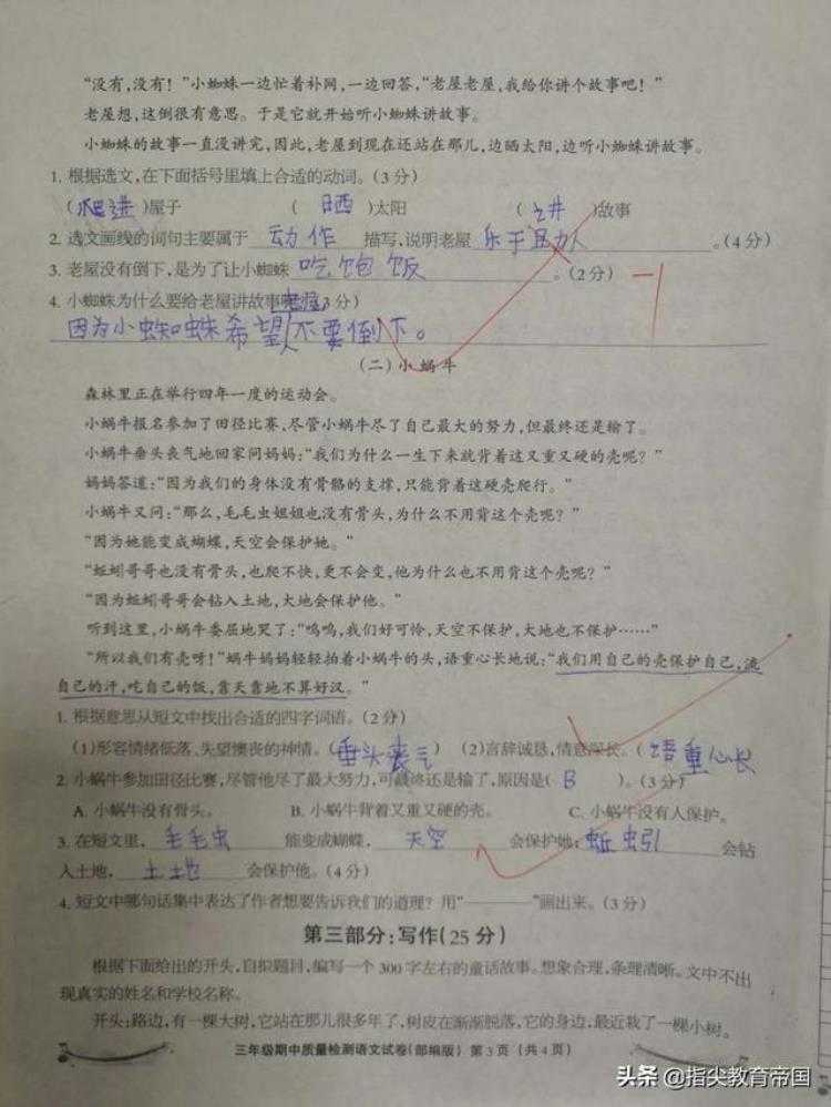 小徐老师看了看三年级语文试卷,发现确如老师们所言,孩子们要想考出好成绩,有些题还真不是老师教的。
