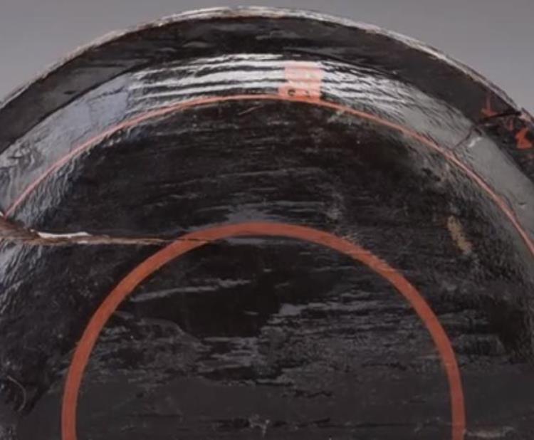 专家经过清理后,发现是两件精美的髹漆陶壶,黑漆为底,上面绘制着红色的图案。