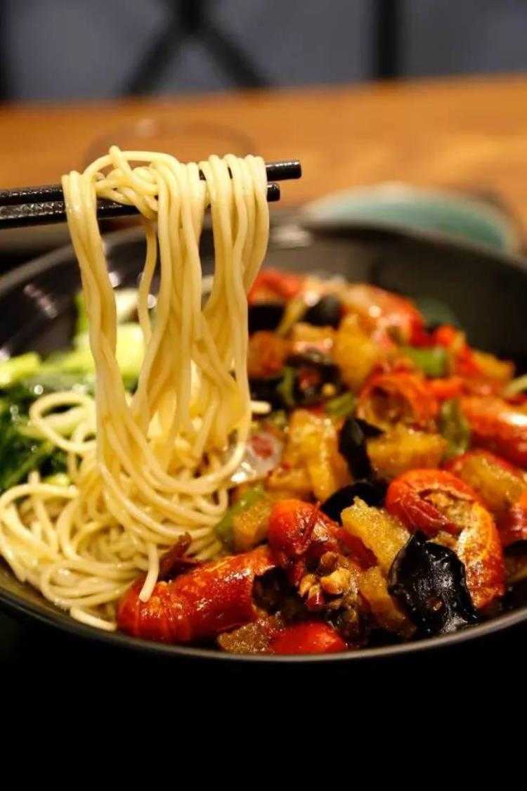 足足十二只龙虾,超过半斤!全部用鲜活龙虾,现场洗净去头,用秘制配方制作香辣龙虾,再和龙虾卤子一起浇到Q弹的面条上