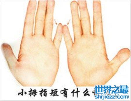 小指长度过短小拇指短:小指长度在无名指第三指节横纹之下,在无名指的第二节位置,也称小指过不到三关。其实大多人的小指长度都是这样,主要原因是小指的起始位置较低。