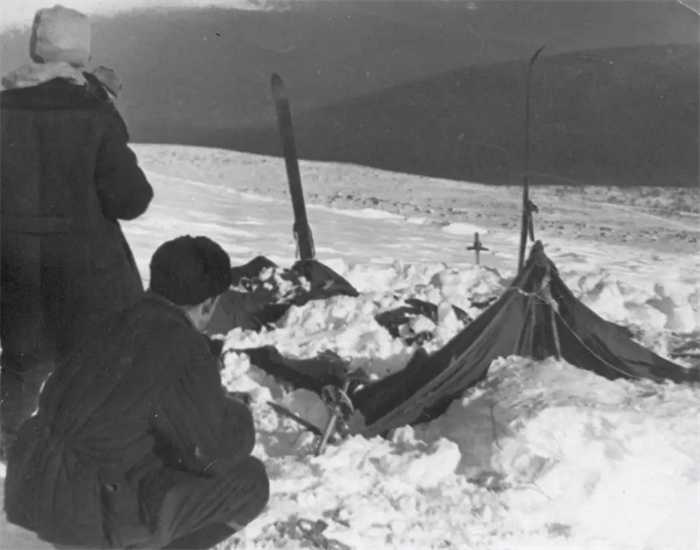 他们在距离山顶海拔300米的地方发现了帐篷,就是登山队所留下的。此时帐篷已经塌陷,有被不明利器划破的缺口,外面有一排赤脚行走的脚印,尽头是前方的一片森林中。一开始人们以为当时可能发生了雪崩,可是现场却丝毫没有雪崩的迹象,他们慌张逃跑。