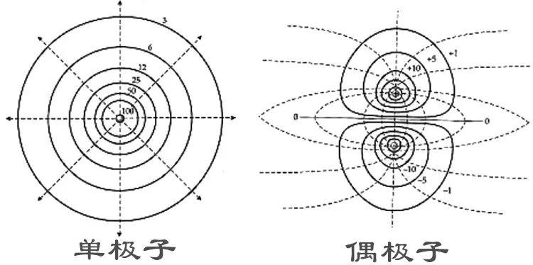 在电力中,不管是正负电荷我们可以把它们组合在一起,也可以让一个单独的正电荷或一个单独的负电荷独立的存在。但在磁力中,多个磁极可以配置在一起形成磁铁,但不可能存在一个孤立的“北极”或“南极”。也就是说,你把磁铁掰开,不会分成一个北极和一个南极,而是分开的磁铁会同时拥有南北极。物理学中,相反的电荷或者两极结合在一起时,我们就叫它偶极子,当一个单独的电荷存在时,我们就叫它单极子。