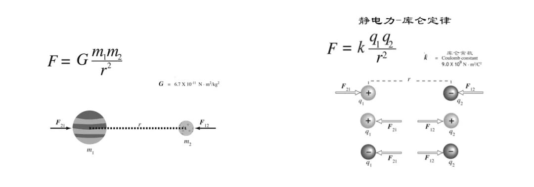 从上图就可以看到,引力公式和静电力公式在形式上完全一样,很工整。而且对于两个电荷粒子来说,力也是一样的(大小相等方向相反),唯一不同的是电荷比质量(质荷)多了一个符号(负电荷),因此电场力可以向内,也可以是向外的。这也体现了对称性!另外电力与另一种力的关系非常密切,那就是磁力。