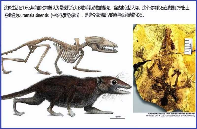 人类演化进化比较清晰的路线图可以追溯到1.64亿年前,哺乳动物的始祖就出现了,但在恐龙霸主的威慑下,过得小心翼翼,很是艰难。这个证据就是2013年在中国辽宁出土一具像老鼠的“微小柱齿兽”,这具只有14cm长的化石被认为是最早的哺乳动物化石,因此是现代哺乳动物的最早始祖;人类是哺乳动物的一个分支,这具化石也被认为有可能是人类祖先,由此科学家们将这具化石命名为“中华侏罗纪妈妈”。