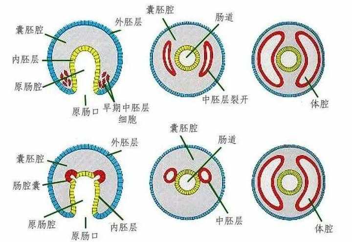 从两胚层到三胚层是一个巨大的飞跃,因为两胚层的腔肠动物是没有真正的体腔的,我们看到的腔,叫做腔肠,腔肠仅仅相当于人类的消化道。有了中胚层之后,才能形成体腔,并促进各个胚层的演化。三胚层出现之后,代谢能力提升,像腔肠动物那样,吃喝拉撒都一个口的生存方式,明显就已经过于落后了。所以,从三胚层动物开始,在后端重新开了一个口。新开口作为肛门的是原口动物,新开口作为嘴的是后口动物(老生常谈)。