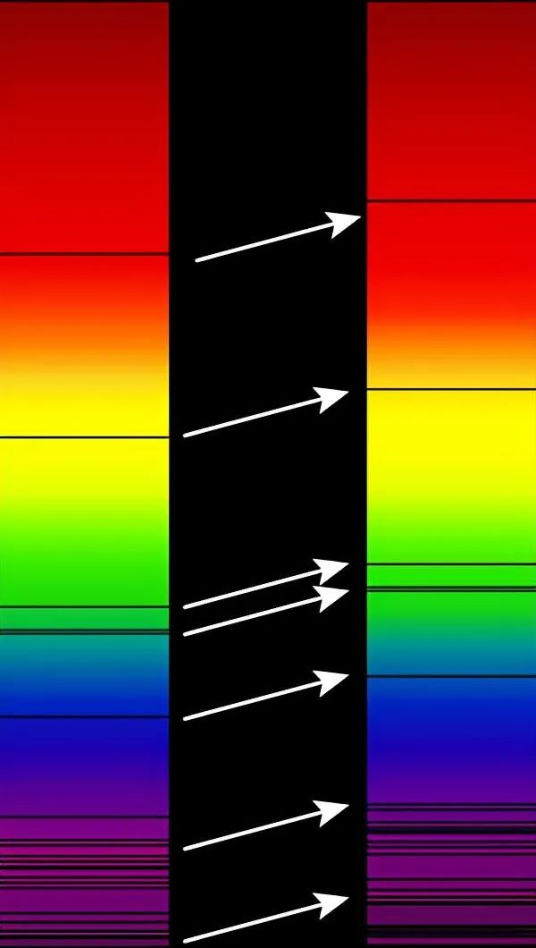 图右是遥远的星系在可见光波段的光谱,与图左太阳的光谱比较,可以看见谱线朝红色的方向移动,即波长增加(频率降低)
