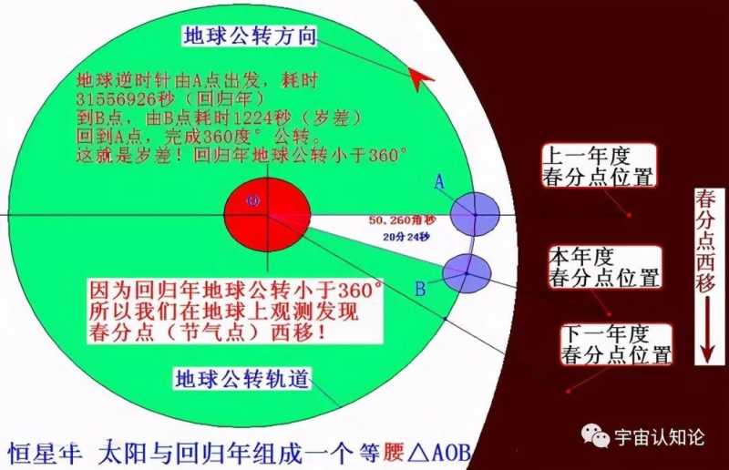 也就是从第一年的春分点开始,到下一个春分点,地球绕着太阳转不了一圈,春分点会提前20分24秒到来。这就是所谓的岁差。