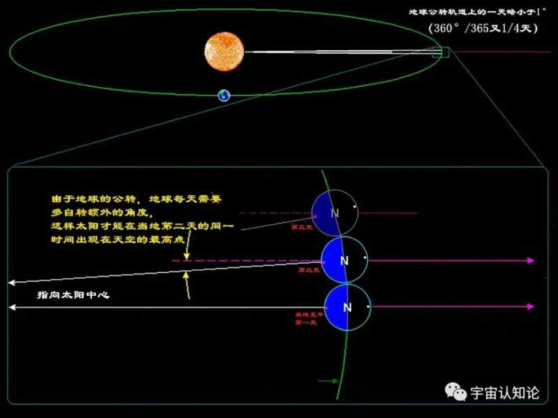 那么第二天,由于地球又绕着太阳行进了略小于1°的距离,为了使得地球上的红点能够与太阳中心对齐,因此地球就必须额外自转一个角度,转这个角度正好用时3分56秒。加起来正好24小时。