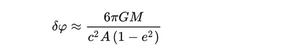 当将各种常数、定义以及变量代入爱因斯坦场方程,再进行一系列复杂的推算之后,人们得到如下进动角位移公式;再代入太阳质量以及水星轨道一系列参数,物理学家们准确地得到了38角秒这个值。