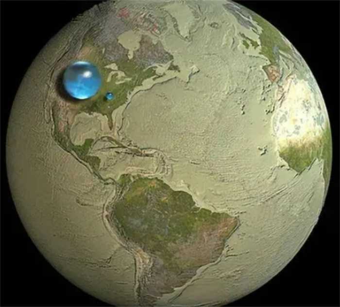 虽然地球表面百分之七十一的面积都被水覆盖,但如果把全球所有的水都汇集到一起,只有这么大,差不多是一个直径1380公里的水球。