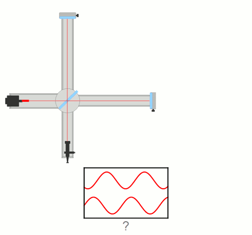 因为同为光速,在仪器静止的时候路程也相等,所以这两束光会同时到达下端的干涉屏上,即图左。当仪器相对运动时,例如向右移动(上图右),在伽利略的相对性原理下,水平的光会产生速度的叠减:V(减少的蓝光) = u(原蓝光) - v(仪器移动速度),即蓝光的相对速度慢了,或者可以肉眼观察,仪器向右移动,蓝光的路程长了,所以蓝色光会晚到达。