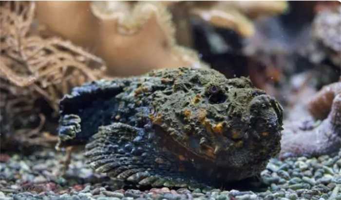 石头鱼是海洋中毒性很强的一种鱼,也是长相非常奇怪的一种鱼,它会将自己伪装成一块毫不起眼的石头,出其不意的给予猎物致命一击,如果有人一不留神踩着了它,它会毫不犹豫地进行还击,并且释放致命剧毒物质,它的背部拥有12到14根锐利的突刺,能够穿透脚掌,使人中毒后处于剧烈疼痛中