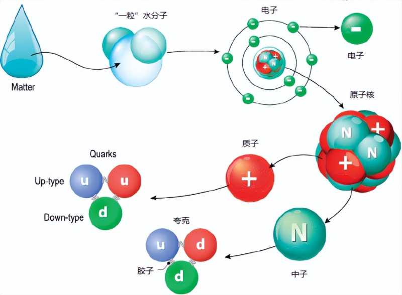 我们原本认为物质的最小单位是分子、原子,后来发现原子可以继续再分,分成电子与原子核,电子核又可以分为质子与中子。后来又发现质子与中子是由(三价)夸克与胶子所构成。