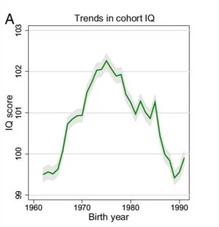 位于挪威的拉格纳.弗里希研究中心做过智商测试实验,他们的测试对象有73万成年男子,包含了各个年龄阶段。而结果显示,1990年之后出生的人,智商确实低于1975年的前辈,且大约每一代人都会下降7个点。