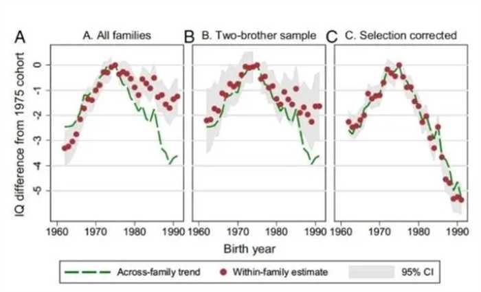 他们测试了不同年代出生的人,发现1975年是个分水岭,这年以后出生的人,平均智商都在他们的父辈之下。