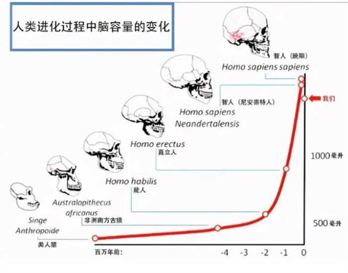 此前中日友好医院神经内科的医生表示,正常人成年之后脑容量在1400到1650毫升之间。这个数据看起来,人类进化了不少,但让我们把时间轴往回拨一拨看,你会有可怕的发现。