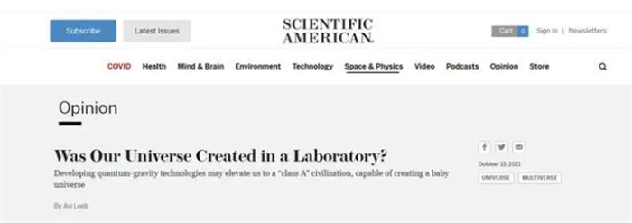 当时阿维.洛布把他的研究结论发表到了《科学美国人》杂志上,说地球生命是高级文明从实验室里创造出来的。他引用了宗教里的上帝创世理论和科学界的量子引力,称外星高级文明可能开发了某种特殊的技术,从量子隧道中创造出了现在的生命。