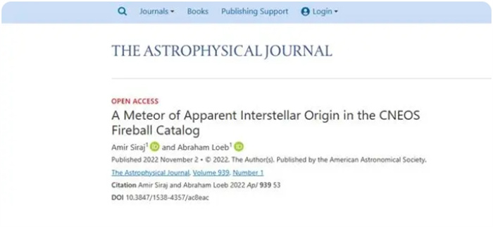 直到2022年11月,哈佛大学才被允许在《天体物理学杂志》上发表论文,公布这颗小流星的存在。美国科学家以这颗流星来到地球的时间,给它起了个代号为CNEOS 2014-01-08。