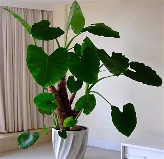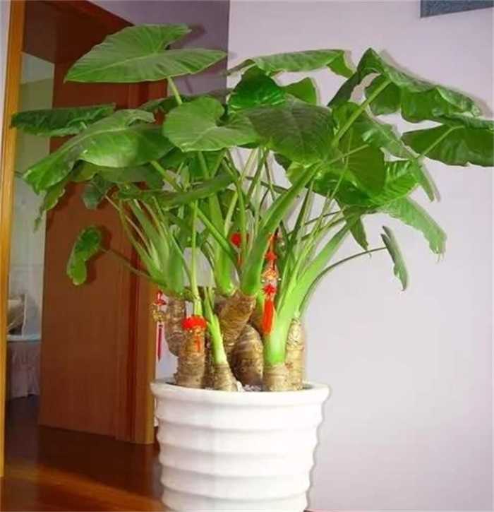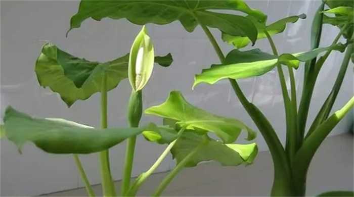 滴水观音的学名叫做海芋,特点是当土壤含水量比较大的时候,便会从叶间端或者叶边缘向下滴水,所以又被称之为滴水观音,是一种非常普遍的家养绿色盆栽,但因为它是热带植物,所以在北方一般是不会开花的,但是如果家里的温度条件适合的话,也是会开花,开花以后也寓意着福气即将到来,很少有人能够看到滴水观音开花,它的植株挺拔,主体粗壮,给人一种古朴典雅的感觉,同时也可以拿出去送人祝福平安幸福。