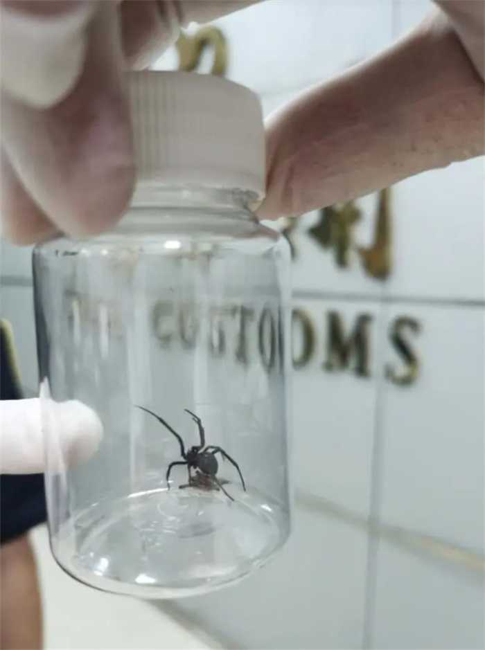 事情是这样的,厦门海关在对一批进口汽车集装箱进行监管时,发现这些集装箱中有一只黑色活体蜘蛛。在发现活体蜘蛛以后,工作人员就开始对集装箱进行消杀、并对车辆、集装箱进行了非常仔细的检查,最终在集装箱的角落那里抓到了一只活体蜘蛛。这只活体蜘蛛有点特别,它的身体是黑色的,但是腹部却有红色斑点,经过鉴定,这只蜘蛛就是“黑寡妇”间斑寇蛛。
