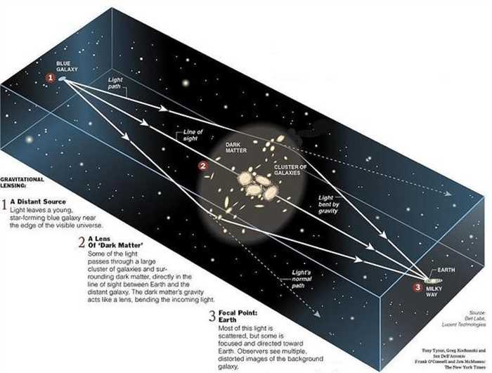 除了通过星系旋转现象来发现暗物质外,科学家们还可以通过引力透镜现象来发现暗物质。引力透镜现象是指强大的引力场可以弯曲光线,使得远处的天体看起来变形或者重复。通过观测这些变形或者重复的图像,人类可以推断出引力透镜前面有多少暗物质。