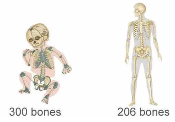 人类的骨骼数量并非一成不变的。在不同的生命阶段,人体的骨骼数量也会有变化。初生婴儿拥有最多的骨头,达到305块,而在儿童时期,骨头数量为217~218块。随着成长,5块骶骨会合并成1块,4~5块尾骨也会合并为1块。成年后,2块髂骨、2块坐骨和2块耻骨会合并成2块髋骨。因此,儿童时期的骨头比大人多11~12块。