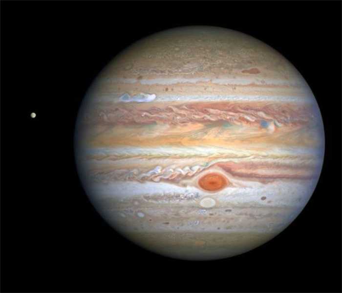木星的表面,有黄、橙、棕、白4种颜色交织着,看起来很漂亮,而且这些颜色会随木星大气中风暴和风的变化而改变。其中,其表面还有一个很明显的特征,一只红色的眼睛。