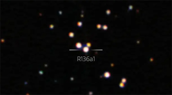 在人类观测的数百万亿颗恒星中最亮的是一颗名为R136a1的恒星,它位于大麦哲伦星系中,距离太阳系约16.3万光年,“R136a1”是一颗O型恒星,其直径是太阳的大约39.2倍,质量是已知恒星中排名第二的,它表面温度有4.8万摄氏度,是太阳的8倍。它的总光度是太阳的大约616万倍,它的绝对星等为-12.24。R136a1的质量是太阳的215倍-265倍,这种质量几乎达到了恒星的质量极限了。