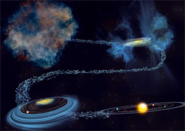 大约46亿年前,位于银河系的一个偏心位置形成了一个巨大的物质盘,其中的气体和颗粒最终融合形成了太阳,而残余的物质则构成了行星和小天体。