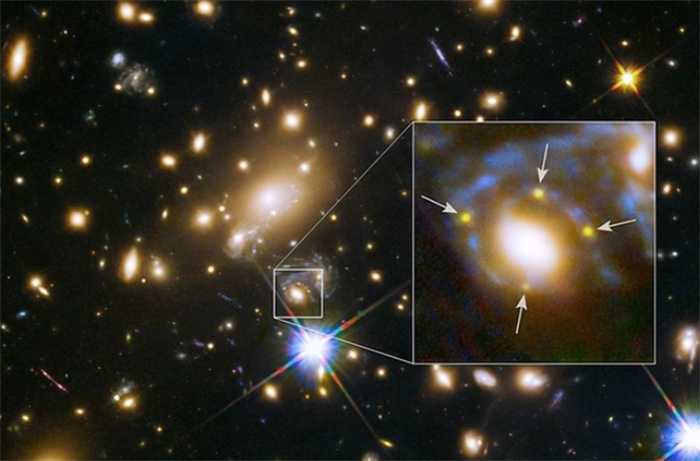 当前景星系完全遮盖住后方的星系,并且遮盖区域变成完美的圆形的时候,后方星系的光就会从前景星系周围折射放大出来,同样也变成一个圆形,这种现象就是引力透镜的小概率版本:爱因斯坦环。