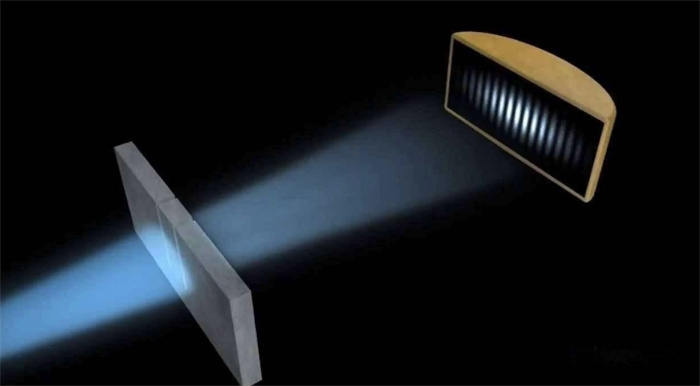 假如光是粒子,光打在背景上板的将是与狭缝对应的两条条纹,假如是波,最终就会呈现像水波一样明暗相间的条纹。